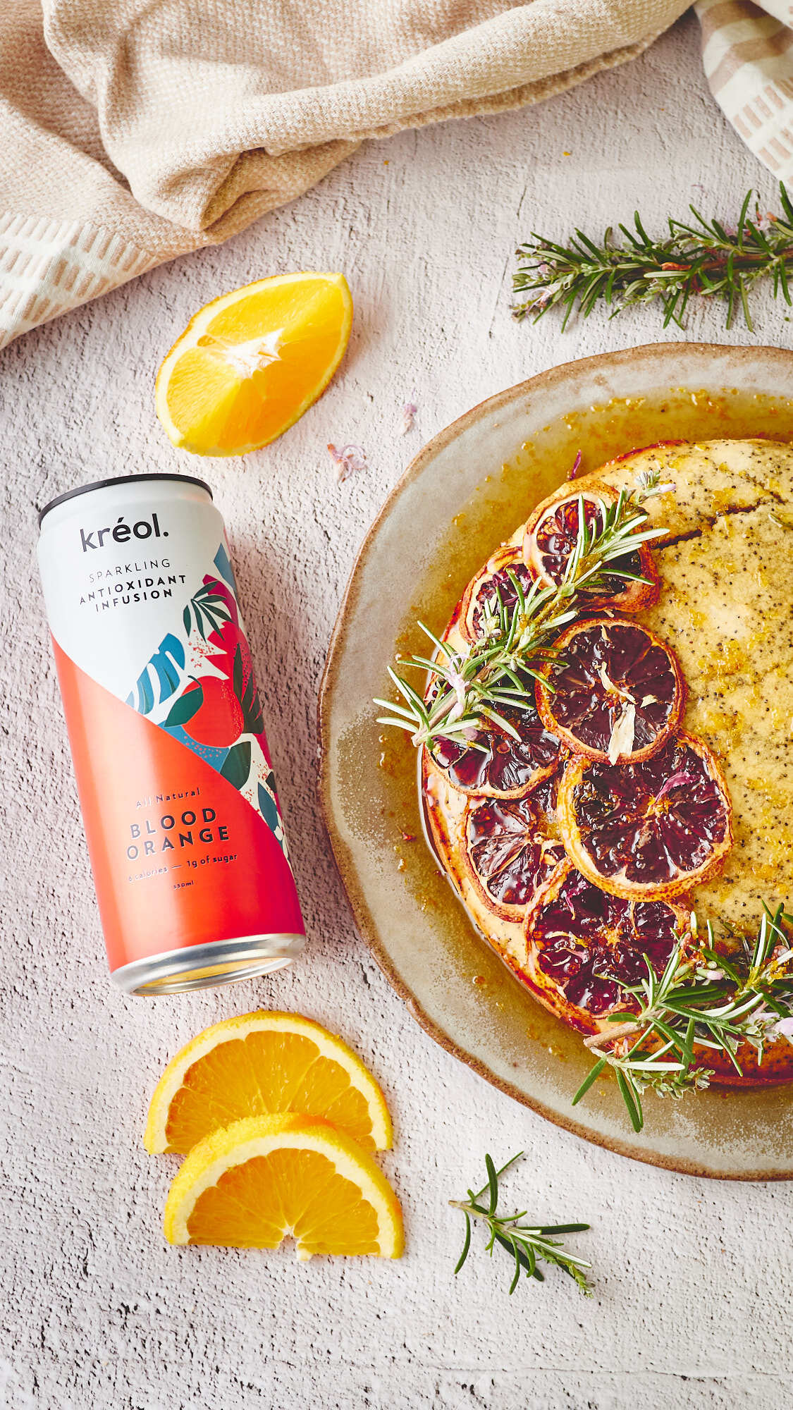 Pre-heat the oven to 180°C. Cream the butter and sugar together. Then add the self raising flour and almond meal and stir through. Add the apple sauce, vanilla, orange juice and Kréol Blood Orange and whisk or use a hand mixer until a batter forms. Then add the orange rind and poppy seeds and stir through. Pour mixture into a lined cake tin and bake for 30 minutes, until a skewer comes out clean. Let cool, and then decorate with dehydrated orange slices and rosemary.
